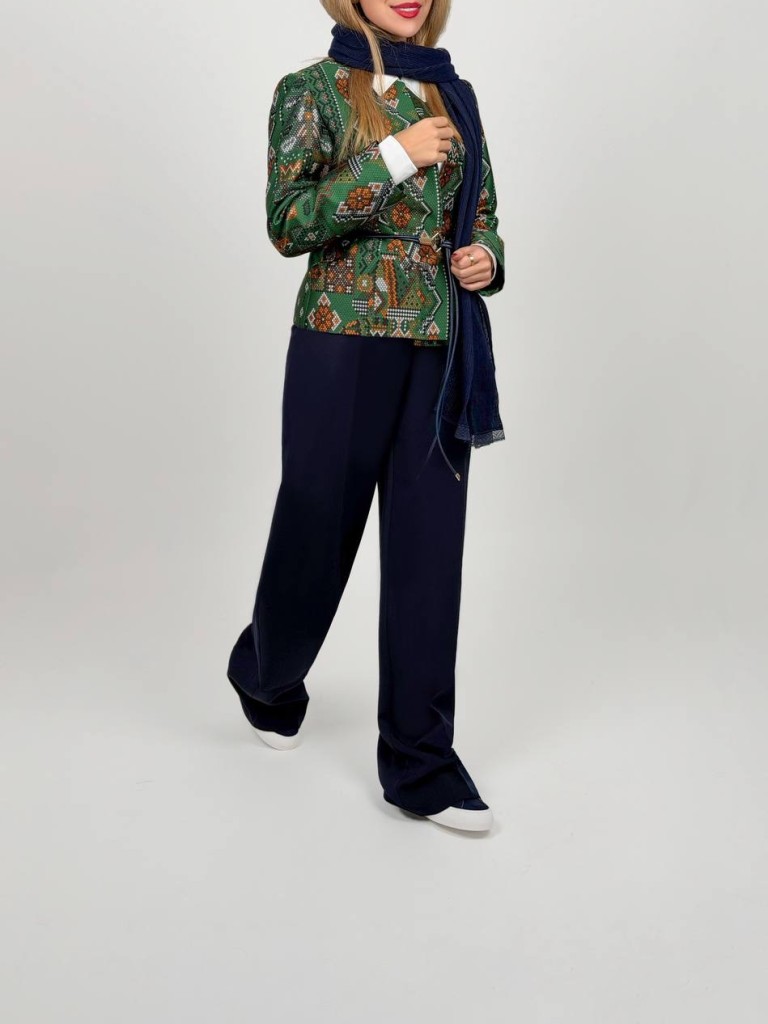 کت ژاکارد طرحدار سبز + شلوار پارچهای راسته + کفش لوفر -