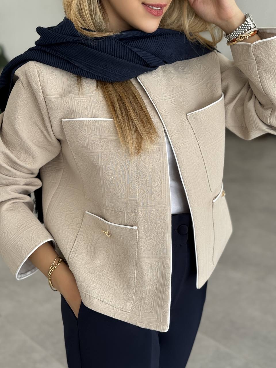 کت ژاکارد کرمی زنانه مدل Paris از برند سارا مجیدی، انتخابی بینقص برای خانمهایی است که به دنبال طراحی کلاسیک، رنگ روشن و جزئیات لوکس هستند. پارچه ژاکارد برجسته، رنگ کرمی شیک و دوخت حرفهای، این کت را به آیتمی ماندگار و خاص در کمد پاییزی شما تبدیل کرده است. Paris، تعریف واقعی از شیکپوشی زنانه و کلاسیک است 🤍✨