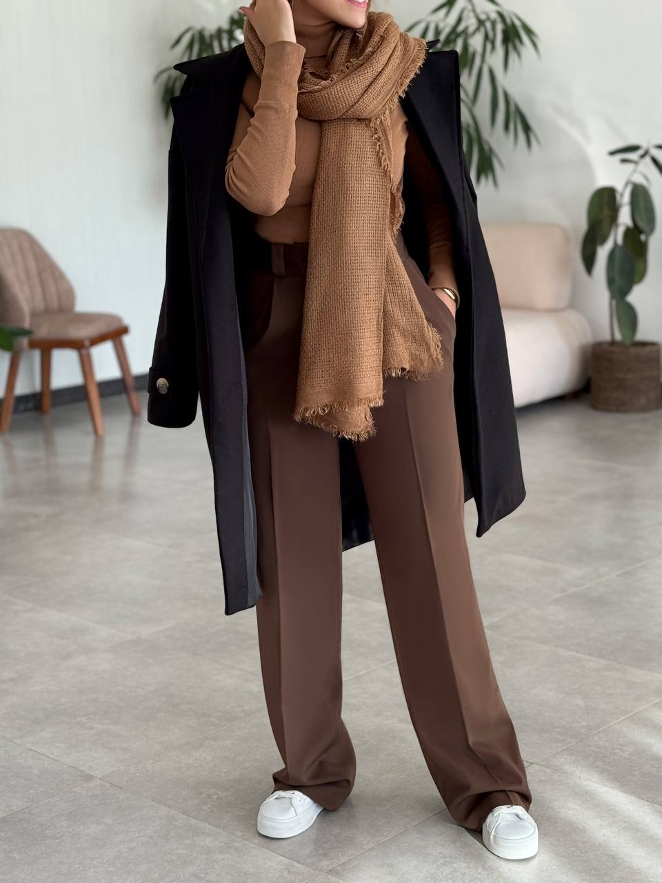 - برای استایل زمستانی خاص: ترکیب با بوت بلند، یقه اسکی و کیف دستی مشکی یا قهوهای تیره.