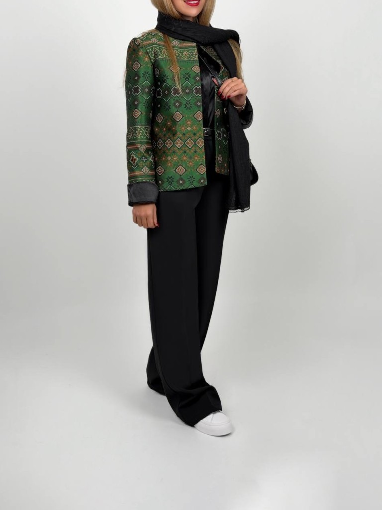 ✨ تضاد بین طراحی پازلی کت و سادگی دامن، جلوهای بسیار شیک ایجاد میکند